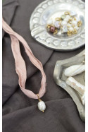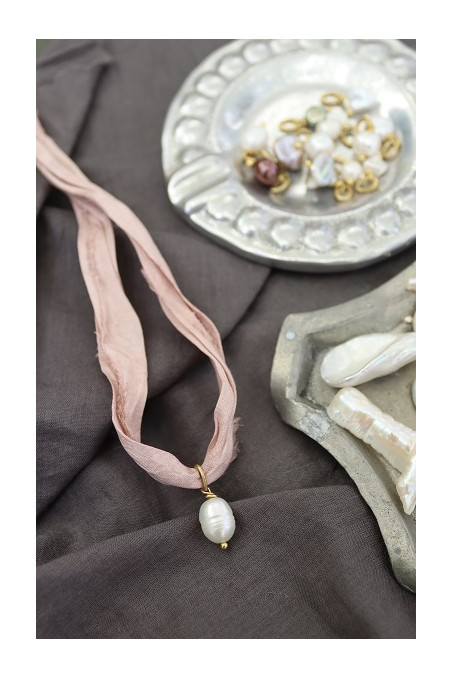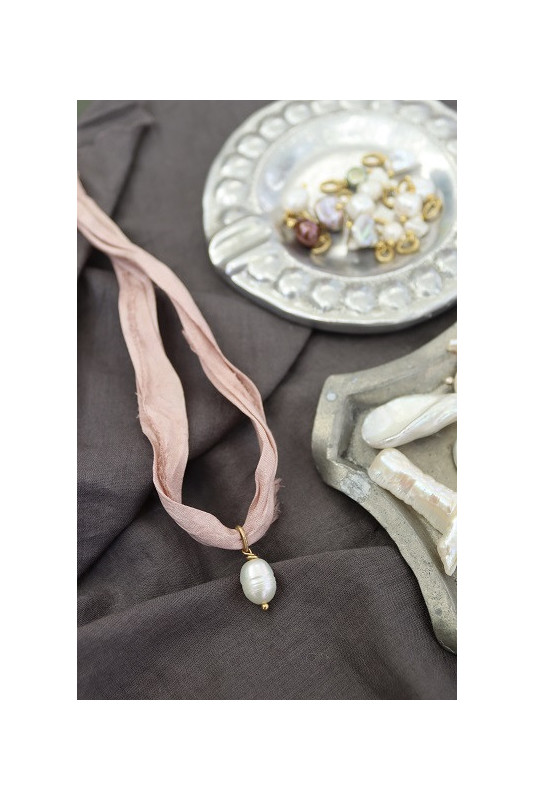 Colgante / Pulsera de perla cultivada con cinta de seda en diferentes colores montada en latón.
