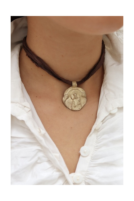Medalla rústica de la Virgen de los Desamparados con cinta de seda.