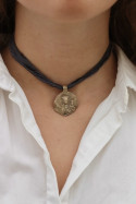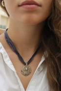 Medalla rústica de la Virgen de la Almudena con cinta de seda.