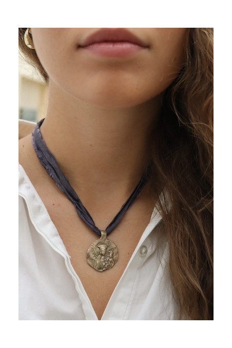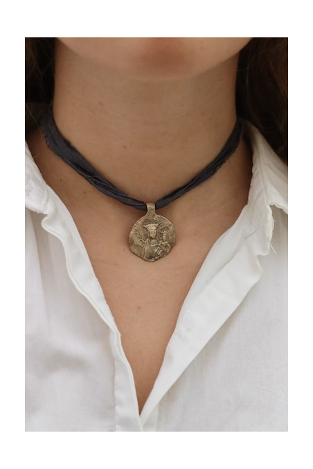 Medalla rústica de la Virgen de la Almudena con cinta de seda.