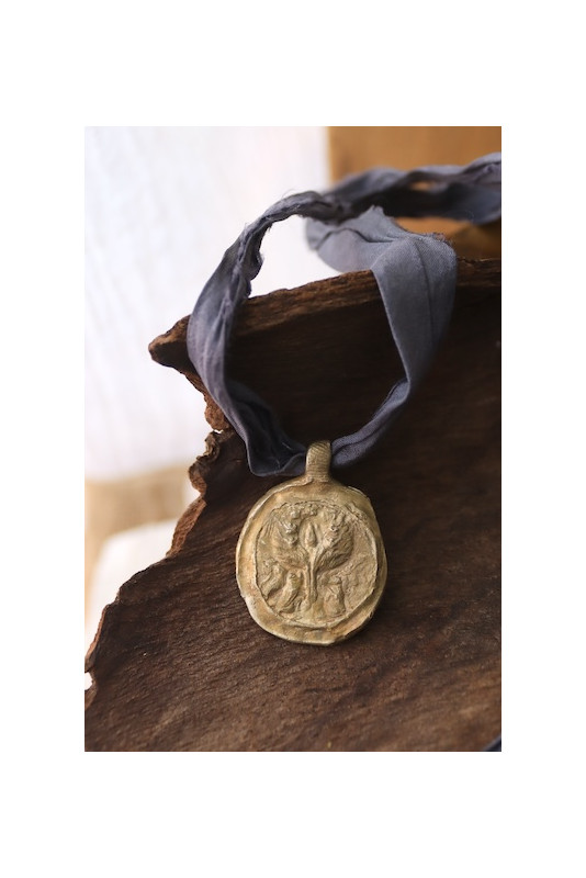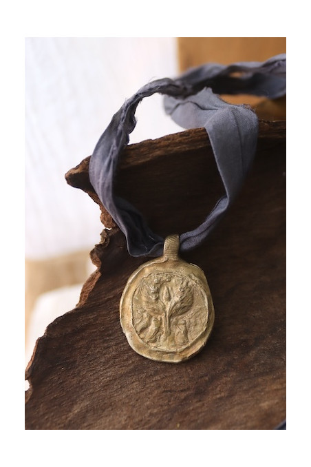 Medalla rústica de la Virgen de la Salceda con cinta de seda.