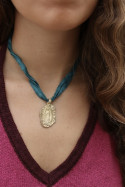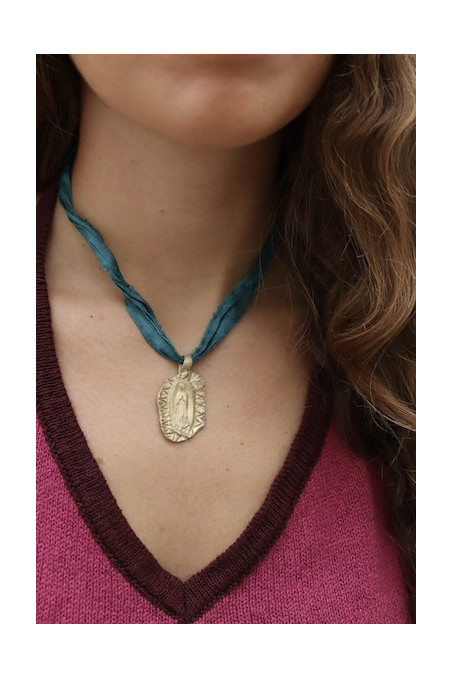 Medalla rústica de la Virgen Guadalupana con cinta de seda.
