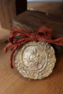 Medalla realizada artesanalmente. Tiene un pequeño calado que la hace diferente a las demás, por eso ofrecemos un descuento especial en esta pieza.  La cinta de seda puede variar con respecto a la foto según los tonos disponibles, haznos saber si tienes alguna preferencia al finalizar la compra en apartado observaciones indicando el número del color correspondiente según imagen.
