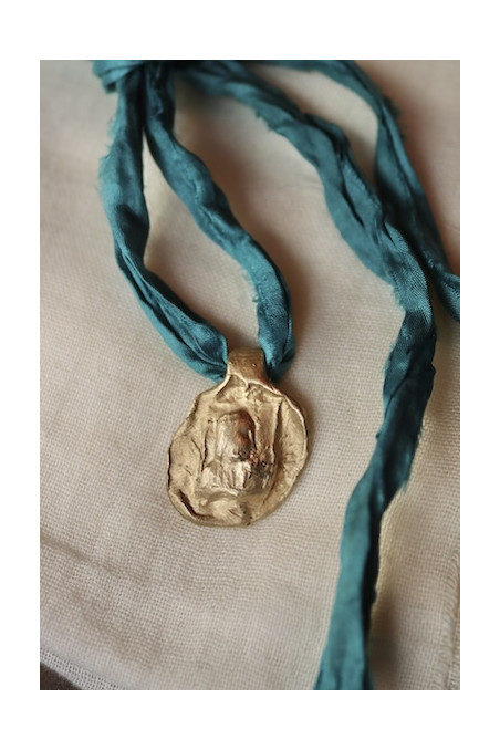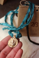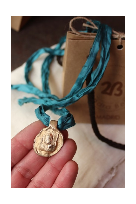 Medalla realizada artesanalmente. Tiene un pequeño calado que la hace diferente a las demás, por eso ofrecemos un descuento especial en esta pieza.  La cinta de seda puede variar con respecto a la foto según los tonos disponibles, haznos saber si tienes alguna preferencia al finalizar la compra en apartado observaciones indicando el número del color correspondiente según imagen.