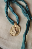 Medalla rústica de la Virgen de Montserrat con cinta de seda.