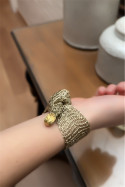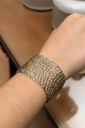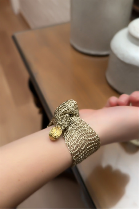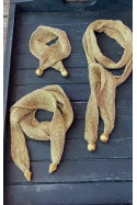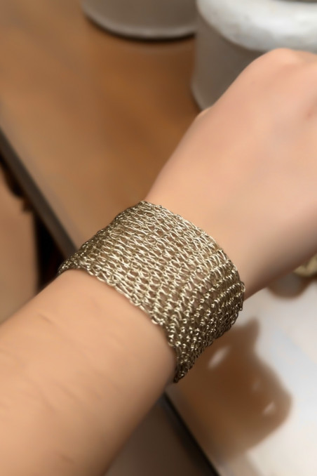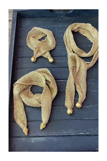 Malla tejida con hilo en tono dorado, plateado o negro rematada con adorno de latón. Disponible en collar ( 110 cm.), choker ( 50cm.) y pulsera ( 30cm.).